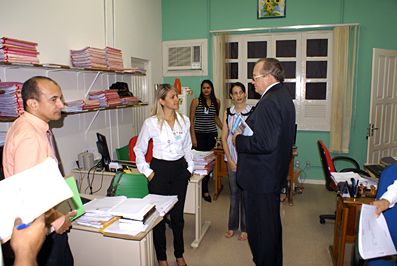 Depois, o Presidente do TJAC visitou as instalações do Fórum Cível Juiz Caio Valladares Filho, que abriga a 1ª e a 2ª Vara Cível. No local, ele conversou com a Diretora do Foro, Juíza de Direito Lílian Braga e com o Juiz Substituto Clovis Lodi, aos quais pediu empenho para o cumprimento da Meta 2 do Conselho Nacional de Justiça (CNJ), de julgar neste ano todos os processos ingressos até o ano de 2005.