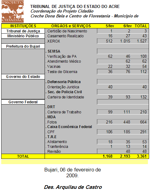 O Tribunal de Justiça do Acre, em parceria com o Tribunal Regional Eleitoral do Acre, realizou nos dias 5 e 6 deste mês uma edição especial do Projeto Cidadão no Município de Bujari, localizado a 23 quilômetros da Capital do Estado, Rio Branco.