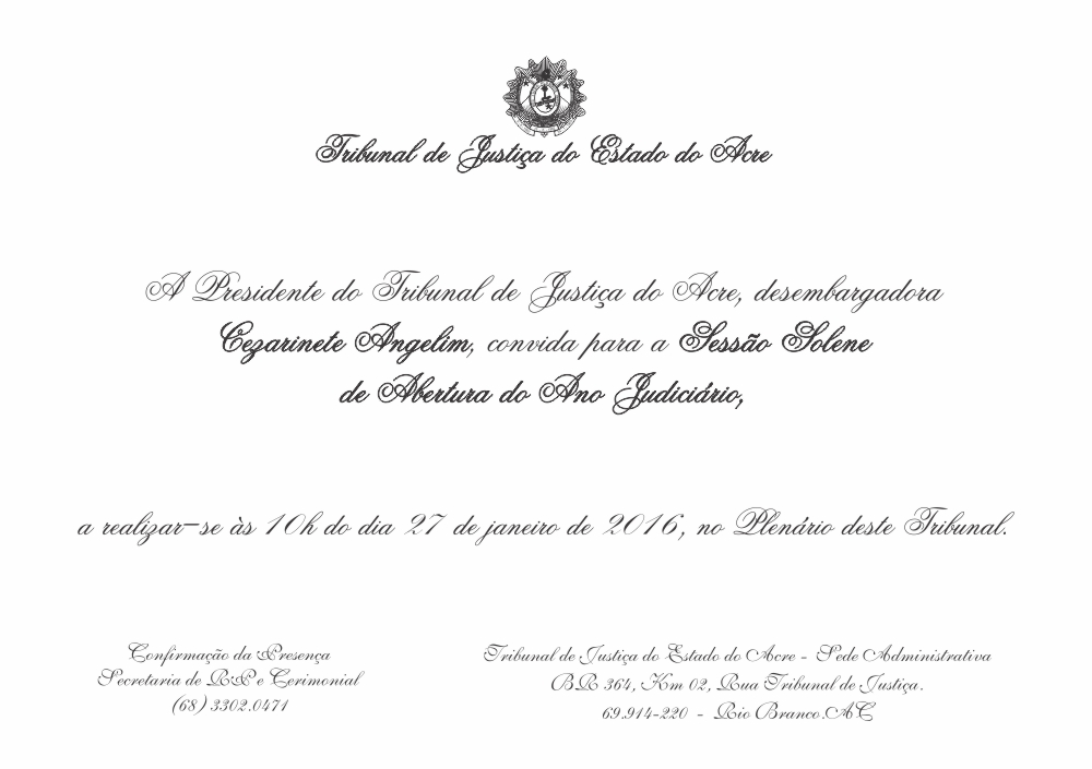 Portanto, para a Sessão Solene, que terá a presença dos membros da Corte de Justiça Acreana, foram convidados representantes dos Poderes Executivo e Legislativo, bem como de todos os órgãos ligados ao Judiciário.