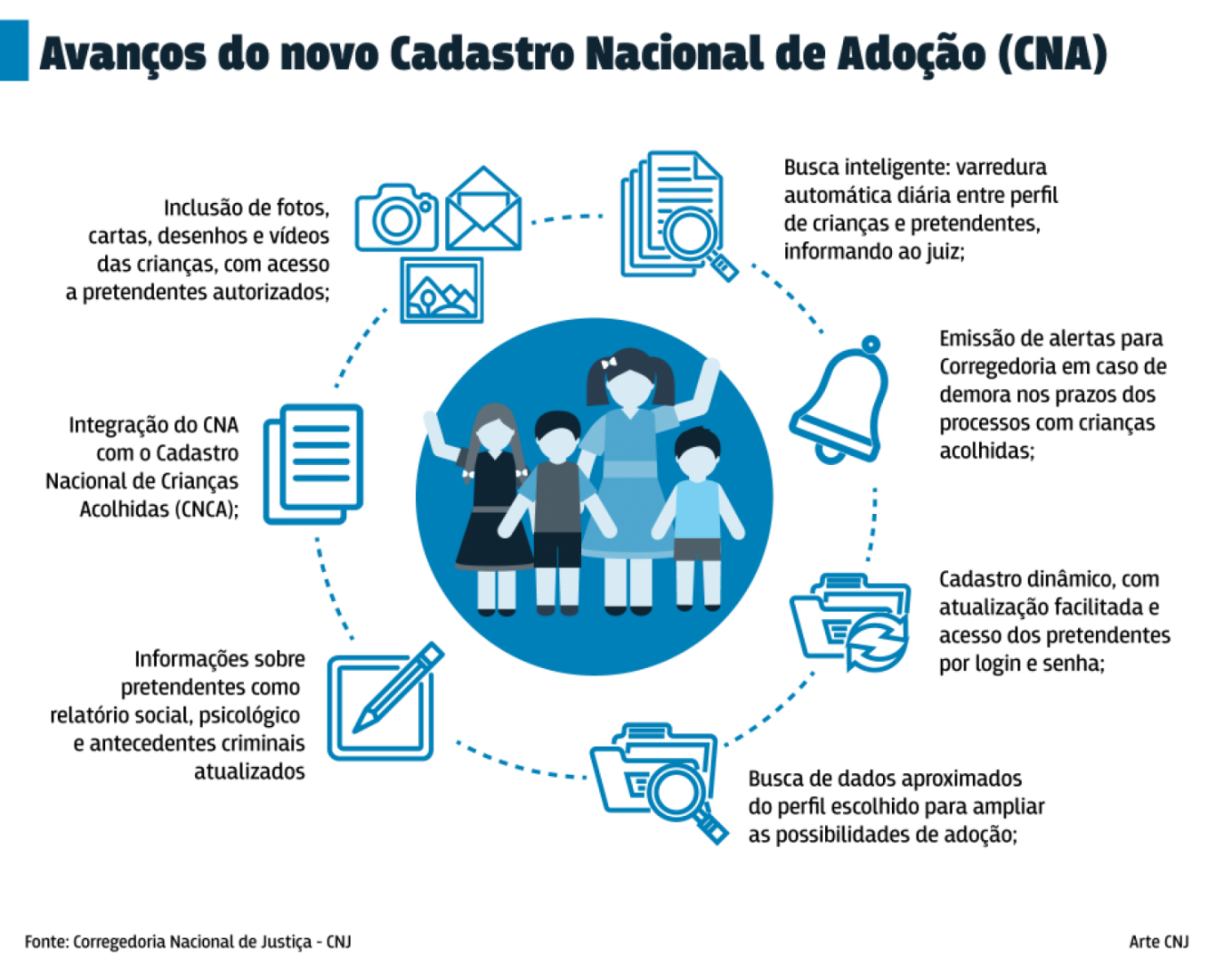 De acordo com os dados do CNJ, quando não havia um pretendente na região, as adoções das crianças dependiam da busca manual realizada pelas varas de infância, para conseguir uma família. Assim, a articulação das informações prioriza os infantes, por meio de uma plataforma que tem a missão de estabelecer mais transparência e rapidez.