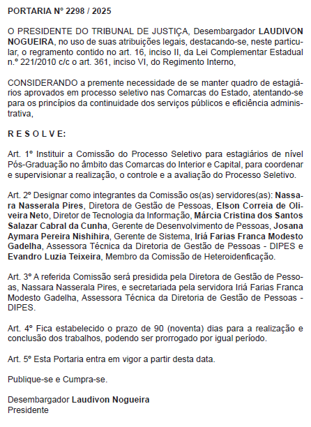 Além de instituir a Comissão do Processo Seletivo para estagiários de nível Pós-Graduação no âmbito das Comarcas do Interior e Capital, para coordenar e supervisionar a realização, o controle e a avaliação do Processo Seletivo, a Portaria nº 2.298/2025 também designa os integrantes da comissão. São eles: a diretora de gestão de pessoas do TJAC, Nassara Nasserala Pires; o diretor de tecnologia da informação, Elson Correia; a gerente de desenvolvimento de pessoas Márcia Salazar; a gerente de sistema, Josana Nishihira; a assessora técnica da Diretoria de Gestão de Pessoas, Iriá Gadelha; bem como o integrante da Comissão de Heteroidentificação do TJAC, Evandro Teixeira.