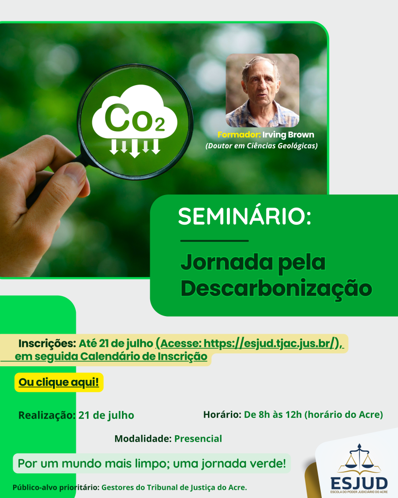 A Escola do Poder Judiciário do Acre (Esjud) abriu as inscrições para o Seminário: Jornada pela Descarbonização. O prazo segue até o dia 21 de julho, mesma data de realização da atividade.