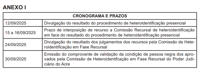 A Comissão de Heteroidentificação divulgou também o cronograma para o Exame Nacional da Magistratura (Enam). A avaliação presencial será no dia 10 de setembro, na sala da Câmara Criminal no Tribunal de Justiça do Acre. As examinandas e examinandos devem comparecer na hora marcada, munidos de documento de identificação original com foto.
