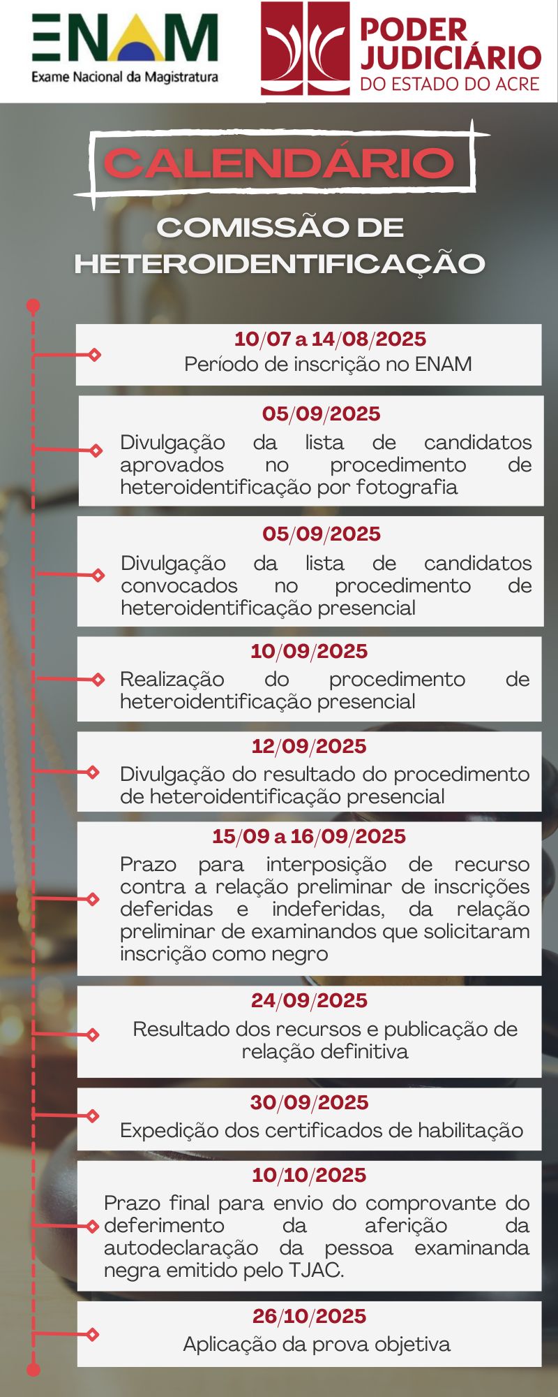 As candidatas e candidatos residentes do Acre que prestarão o 2º Exame Nacional dos Cartórios (Enac) e o 4ª Exame Nacional da Magistratura (Enam), concorrendo às vagas reservadas pela política de cotas raciais, devem preencher o formulário de heteroidentificação. As inscrições do 2º Enac ficam abertas até o próximo dia 13 de agosto e as do 4º Enam até o dia 14 de agosto.