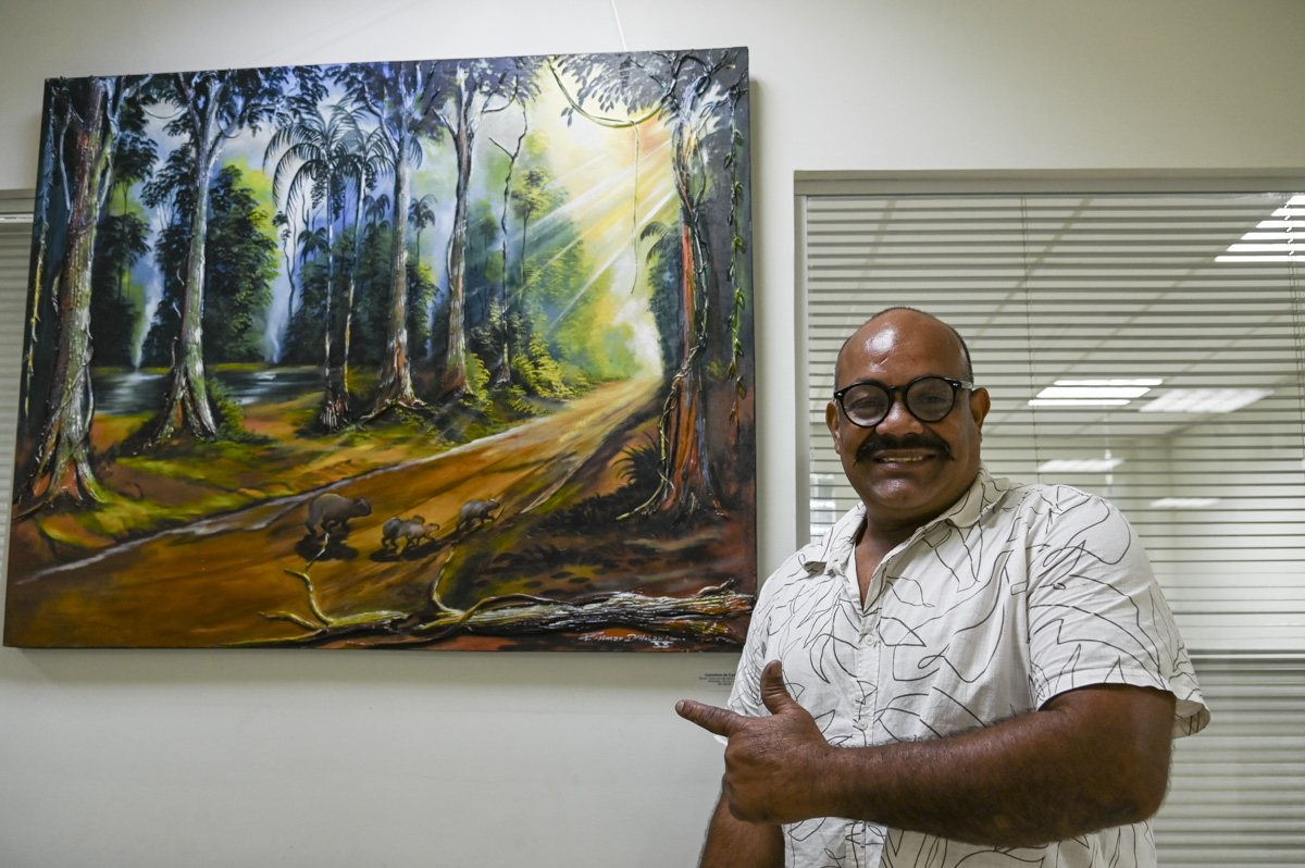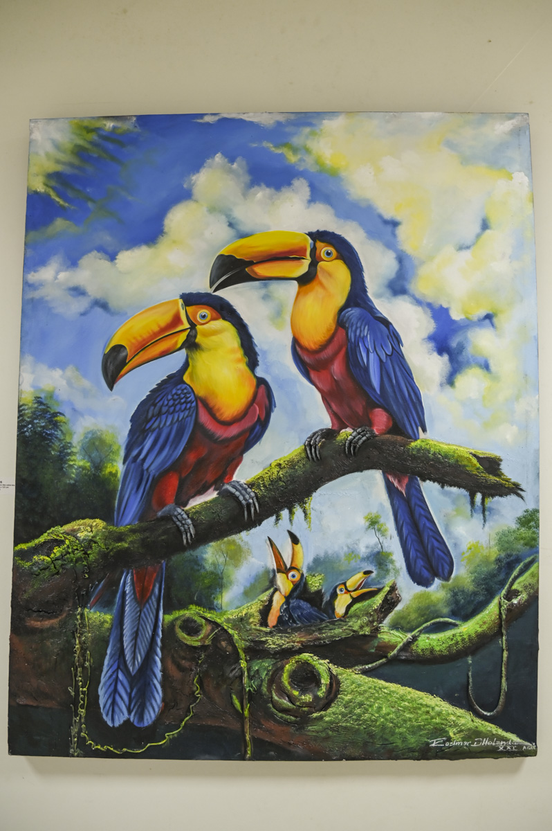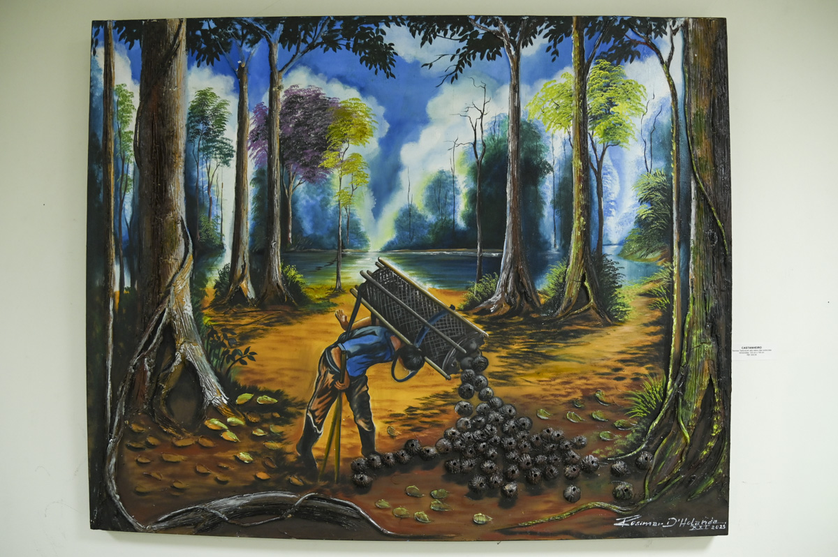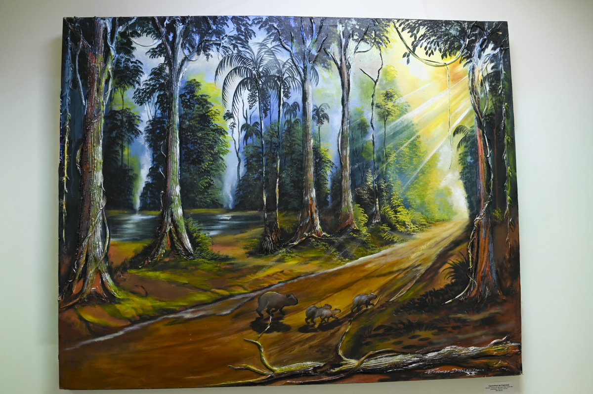 Um casal de tucanos pousado em um tronco de árvore coberto de musgo, um seringueiro caminhando na mata com poronga na cabeça, um cesto cheio de ouriço de castanha sendo virado no chão de terra avermelhada. Cenas assim podem ser apreciadas nas obras do artista plástico Rosimar de Holand. O pintor expõe seus trabalhos até o dia 26 de setembro no prédio sede do Tribunal de Justiça do Acre (TJAC). A visitação pode ser realizada no horário de expediente, de segunda à sexta-feira, das 7h às 14h.