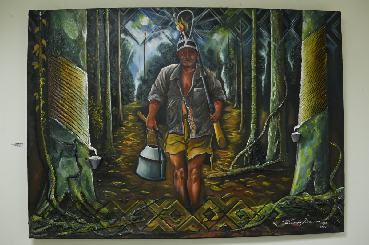 Obras sobre o cotidiano da vida na floresta amazônica são expostas no prédio do TJAC