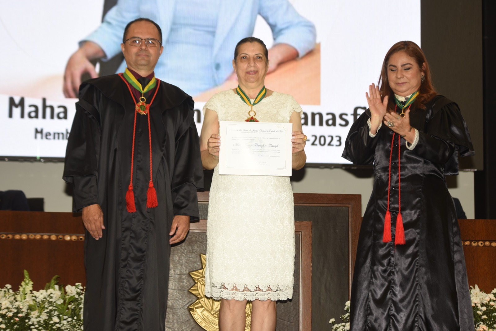 A sessão solene foi conduzida pelo desembargador Júnior Alberto (presidente do TRE-AC), com a corregedora eleitoral, desembargadora Waldirene Cordeiro. Ambos integram a Justiça estadual e também atuam na corte eleitoral. Na cerimônia, a vice-presidente do TJAC enalteceu o empenho da equipe da Justiça Eleitoral que enfrenta desafios logísticos de realizar eleições em meio a floresta amazônica, e ainda falou dos avanços tecnológicos, como e-título e a urna eletrônica para consolidação do Estado Democrático de Direito.