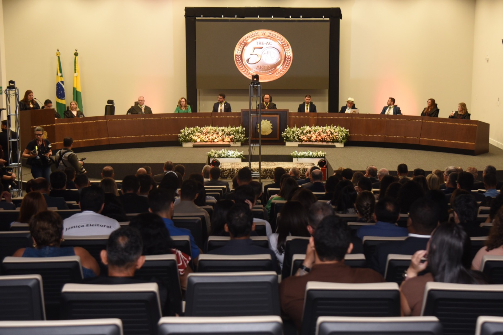 Demonstrando o compromisso com a sociedade e instituições que garantem o Estado Democrático de Direito, integrantes do Judiciário do Acre participaram nesta sexta-feira, 1° de agosto, da celebração dos 50 anos de presença da Justiça Eleitoral no Acre. A cerimônia aconteceu no prédio do Tribunal Regional Eleitoral do Acre (TRE-AC) e a vice-presidente desembargadora Regina Ferrari representou a Presidência do Tribunal de Justiça do Acre (TJAC).