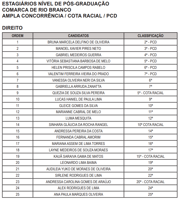 O Tribunal de Justiça do Acre (TJAC) tornou pública a convocação de estagiários nesta terça-feira, 21. Foram chamados aprovados das áreas de Administração, Ciências Contábeis, Direito e Sistema de Informação, ainda foram chamados nível pós-graduação na área de Administração e Direito. Todos serão lotados em Rio Branco.