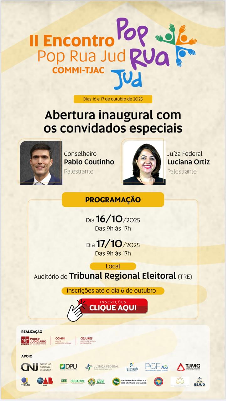 O Tribunal de Justiça do Estado do Acre (TJAC), por meio do Comitê Multinível, Multissetorial e Interinstitucional (COMMI) e com apoio da Escola do Poder Judiciário (Esjud), informa que o prazo para as inscrições no II Encontro Estadual Pop Rua Jud Acre foi prorrogado até o dia 13 de outubro.