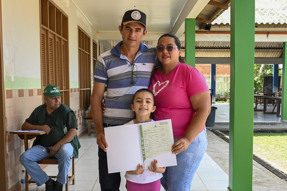 Jaqueline Lira Lima Braga, 39 anos, acompanhada do esposo, Gesimar da Silva Braga, 42, e da filha caçula, 5 anos, foram cedinho pegar o título definitivo da colônia “Deus é por nós”, localizada no projeto de assentamento Triunfo. A propriedade que agora é deles de papel passado fica há 29 quilômetros da cidade. Para o esposo, o serviço na cidade foi uma facilidade. “É muito bom, porque ao invés de você perder tempo, gastar. Então, a facilidade de ter vários serviços em um só setor, é muito bom”, disse Gesimar.
