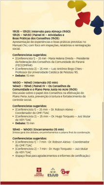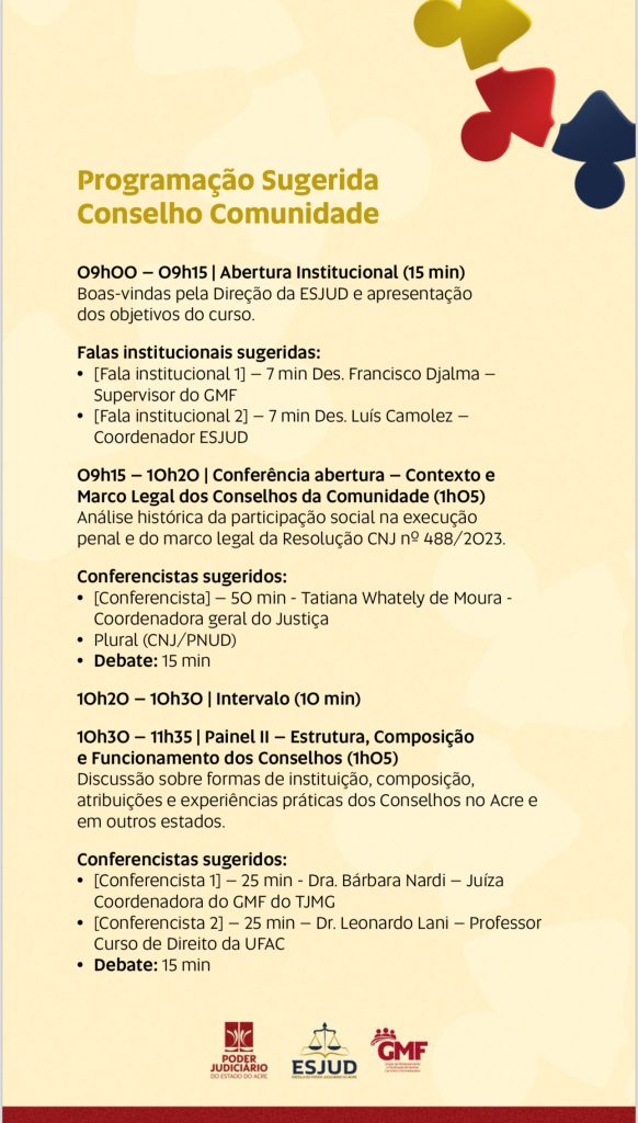 O Tribunal de Justiça do Acre (TJAC) e a Escola do Poder Judiciário do Acre (Esjud) promoverão no dia 3 de dezembro a formação “Conselhos da Comunidade e o Sistema de Justiça”.