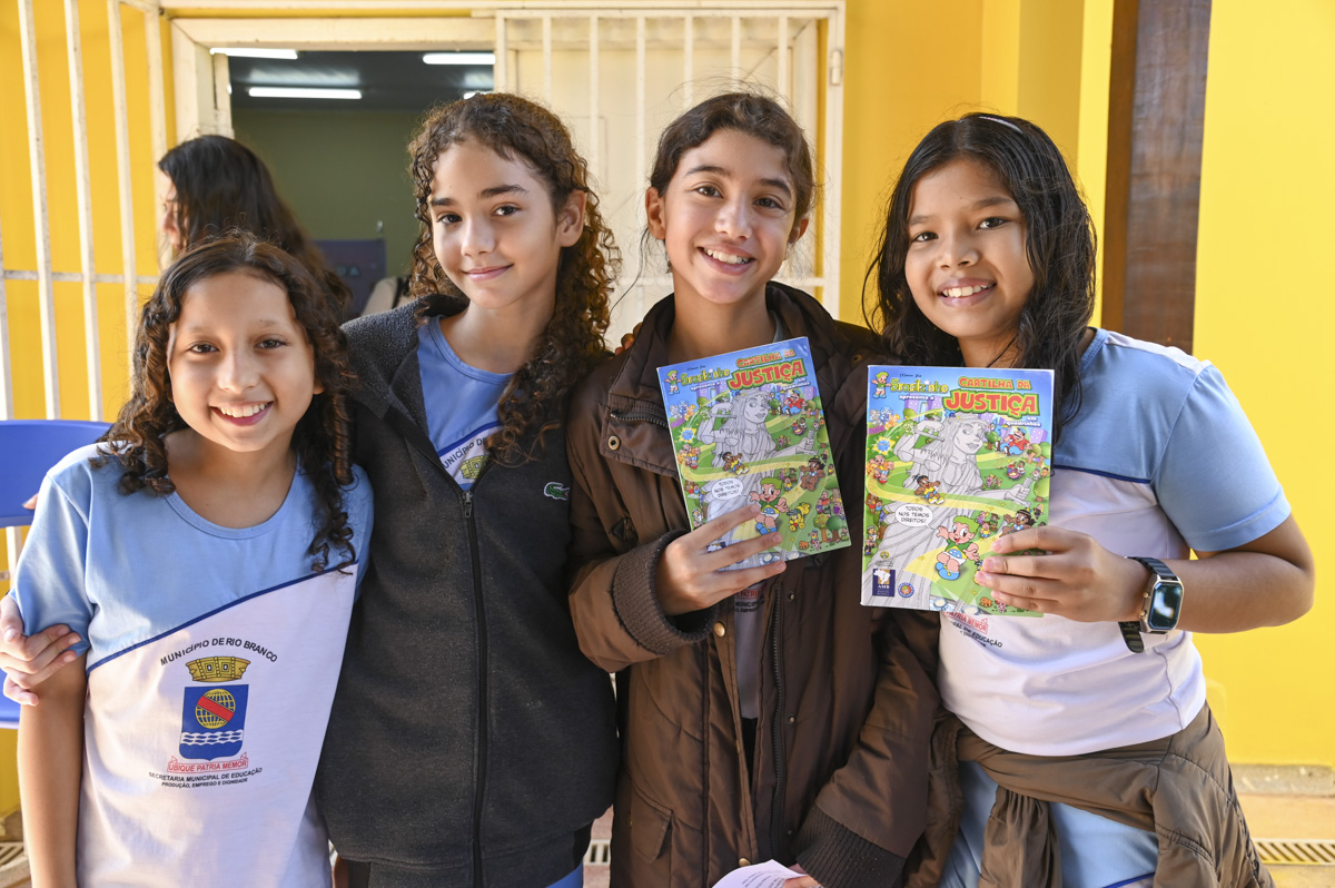 A cada atividade, as alunas e alunos do 5º e 6º ano do ensino fundamental receberam cartilhas em quadrinhos. Com o slogan “Justiça se Aprende na Escola”, o material de apoio utiliza a linguagem simples e foi ilustrado pelo cartunista Marcos Vaz. O protagonista e guia das histórias é o personagem “Brasilzinho”, que possui amigos na narrativa para dialogar sobre cidadania, diversidade e inclusão.
