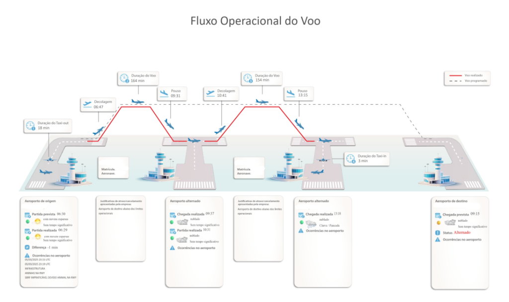 A plataforma também permite acompanhar todo o percurso da aeronave, incluindo o tempo em solo e na pista, informações que costumam gerar divergências entre consumidores e companhias aéreas quanto ao momento exato de início do voo.