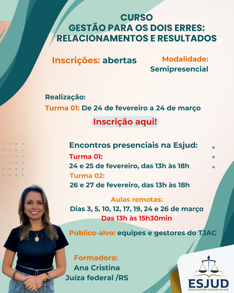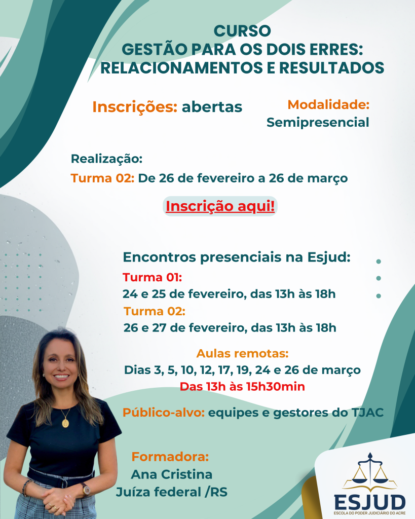Capacitar os(as) participantes para gerir equipes, exercendo uma gestão equilibrada e humanizada, por meio do uso da inteligência emocional e da ética nas relações. Com esse objetivo, a Escola do Poder Judiciário do Acre lança o curso “Gestão para os Dois Erres: Relacionamentos e Resultados”.