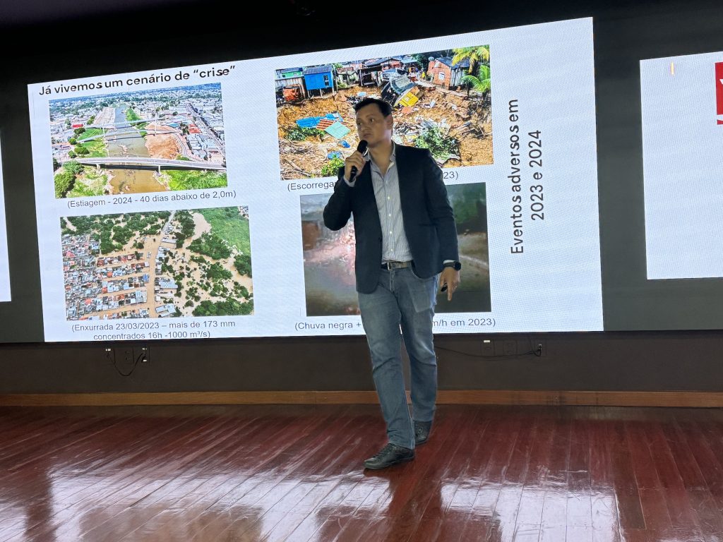 Ricardo Nascimento respondeu a duas perguntas durante sua explanação. À primeira delas, “estamos em um cenário de crise climática em Rio Branco-AC?”, respondeu que ‘sim’, por meio de diversos dados. A exemplo da estiagem e risco de desabastecimento sofrida pela capital do Acre em 2024, com 40 dias abaixo de dois metros; chuva negra e ventos com 60 km/h em 2023, a enxurrada em 2023, com mais de 173 mm concentrados (16h -1000 m³/s), etc.