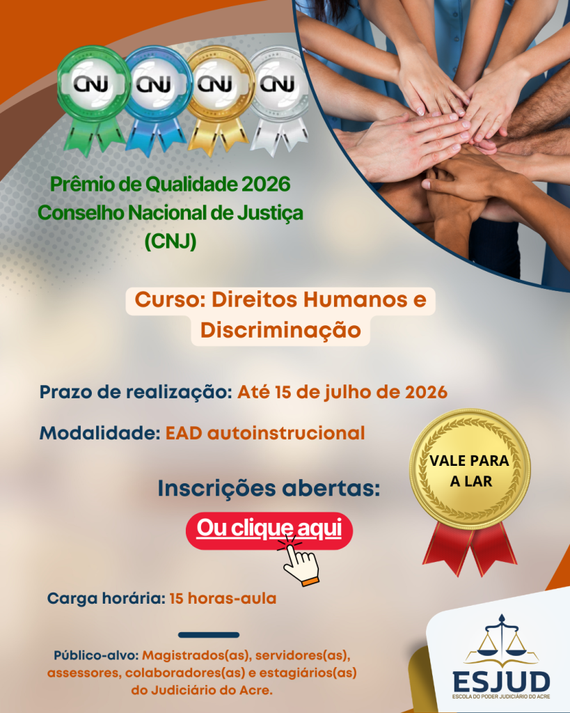 A Escola do Poder Judiciário do Acre (Esjud) lançou o curso “Direitos Humanos e Discriminação”, que está com as inscrições abertas.
