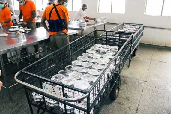 A empresa terceirizada possui o apoio de 36 custodiados trabalhando na UAN. A produção é de 3.200 marmitas a cada turno, isto é, para o almoço e jantar, uma vez que o café da manhã é proveniente de uma contratação externa.