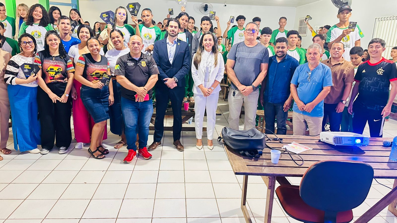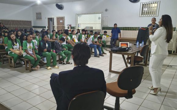 A atividade reuniu alunos com faixa etária média entre 12 a 16 anos, e foi conduzida pela juíza de direito da comarca, Bruna Perazzo, com participação também do defensor público Pedro Veloso, e do delegado de Polícia Cívil, Leonardo Meyohas Neves, em uma iniciativa de conscientização voltada ao público jovem.