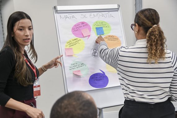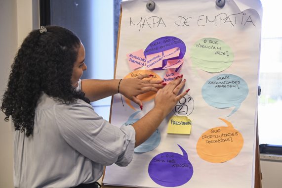 Dentre os quatro grupos, o Grupo 4 elegeu como ator do Mapa de Empatia o presidente da instituição, e o Grupo 2, o oficial de justiça. Então, na primeira etapa, já dialogaram considerando metas, comportamentos e questões técnicas, imergindo no contexto funcional. Contudo, essa cartografia teve uma abordagem multidisciplinar, ou seja, transcendeu as visões departamentais, integrando conhecimentos variados e evoluindo para a criação de soluções mais completas e inovadoras.