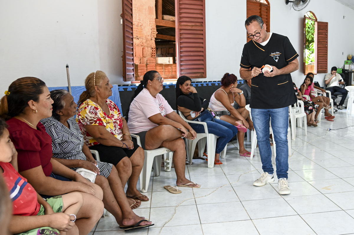 Durante o encontro, o doutor Samuel Alvim realizou uma apresentação sobre saúde e prevenção bucal, enfatizando os fundamentos básicos de escovação e a aplicação de flúor com as crianças.