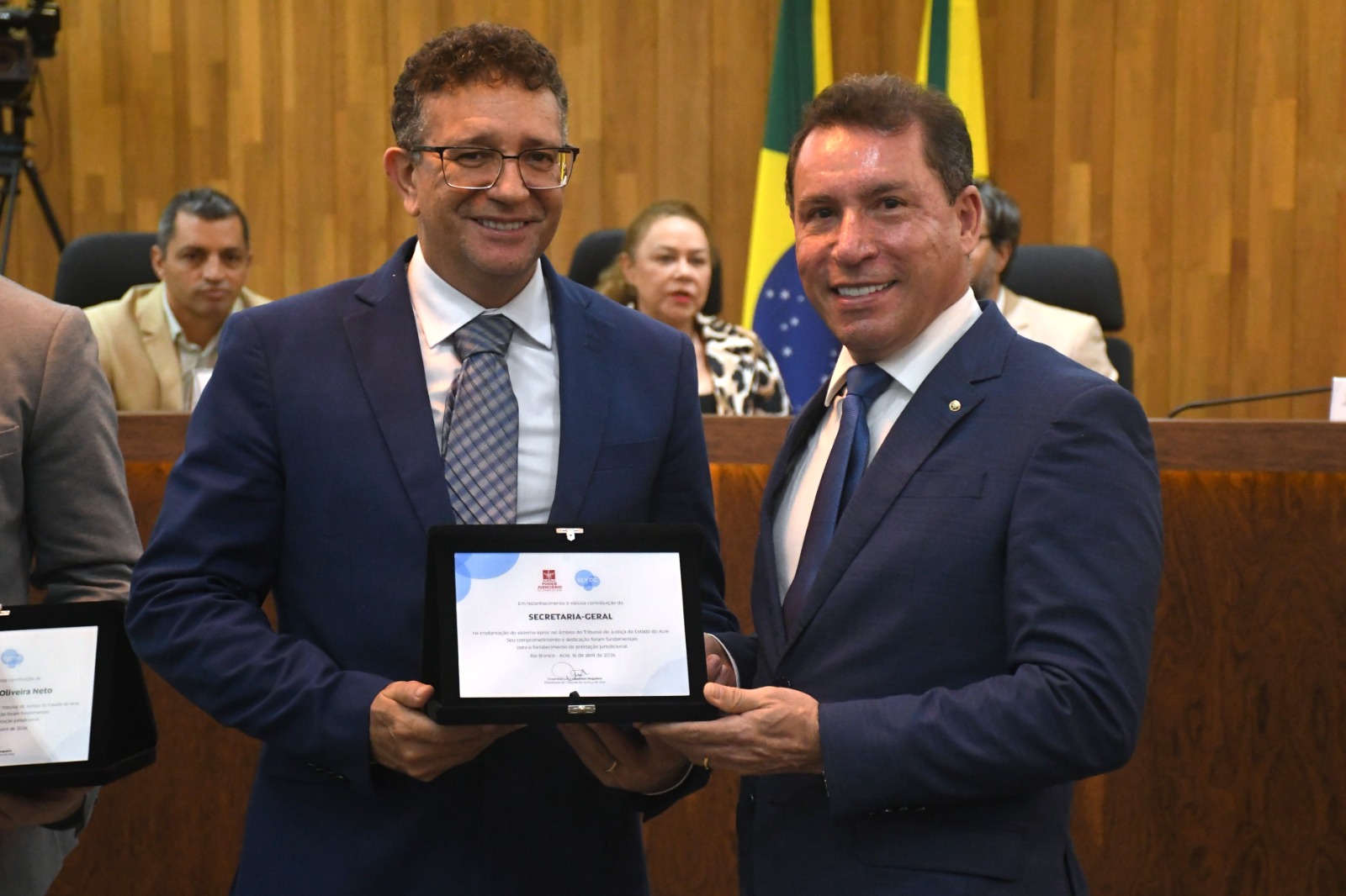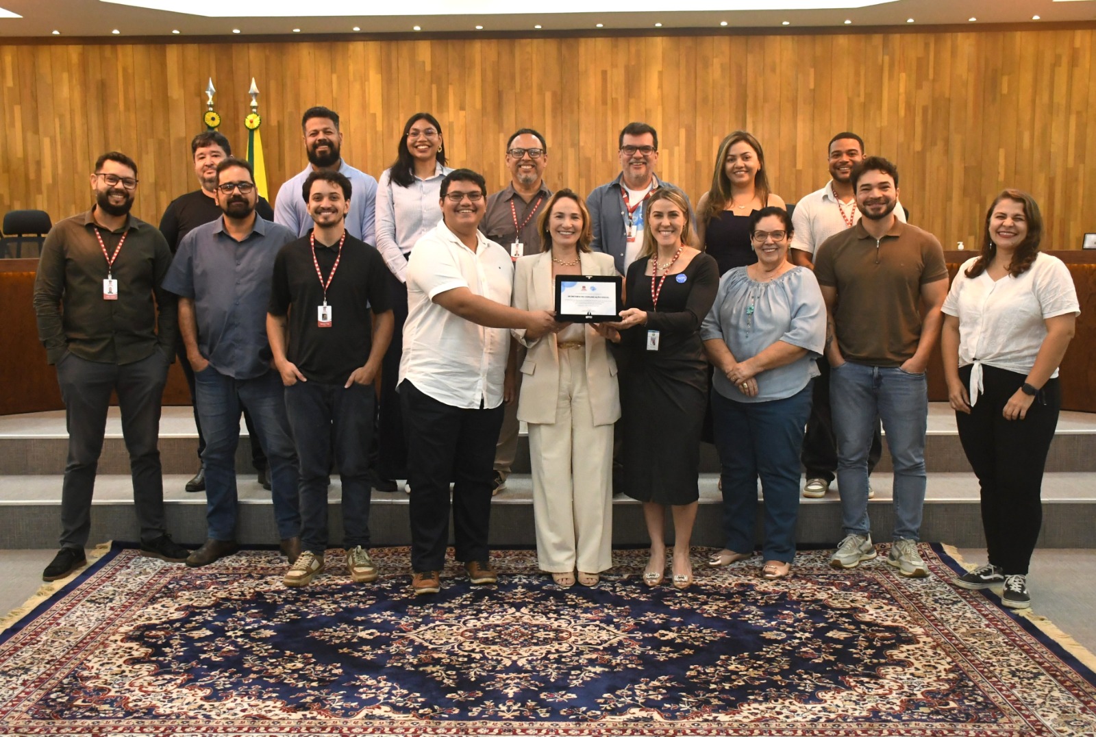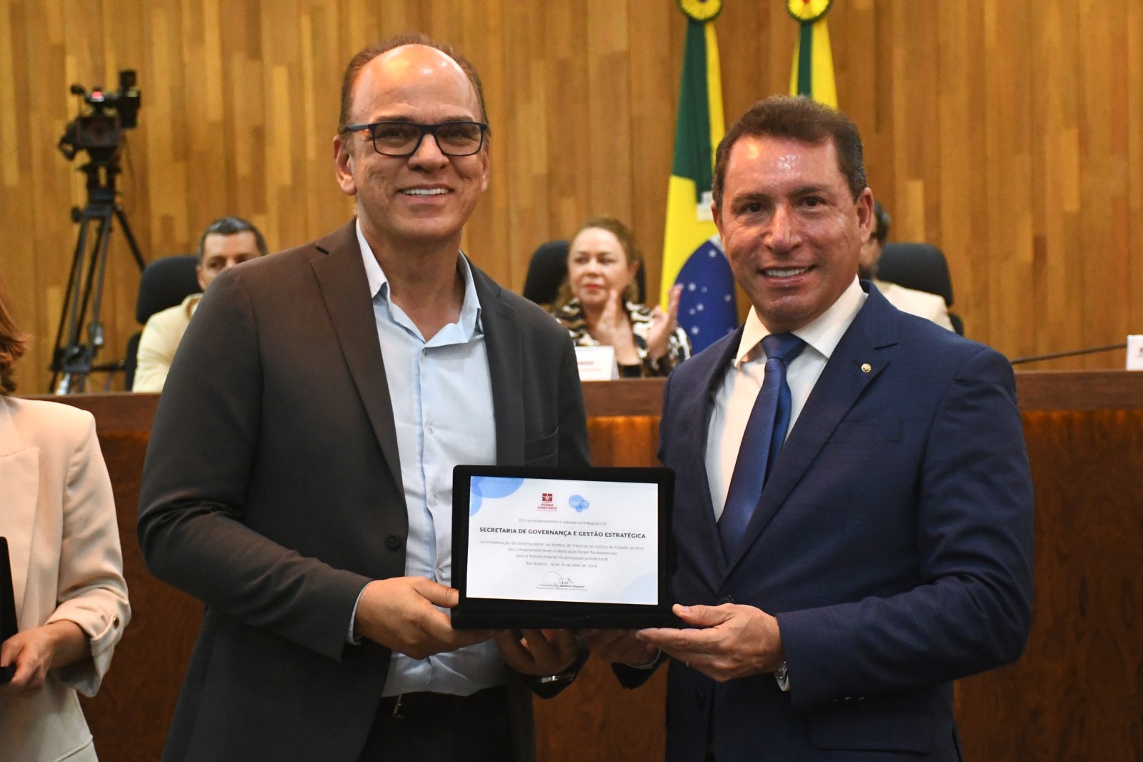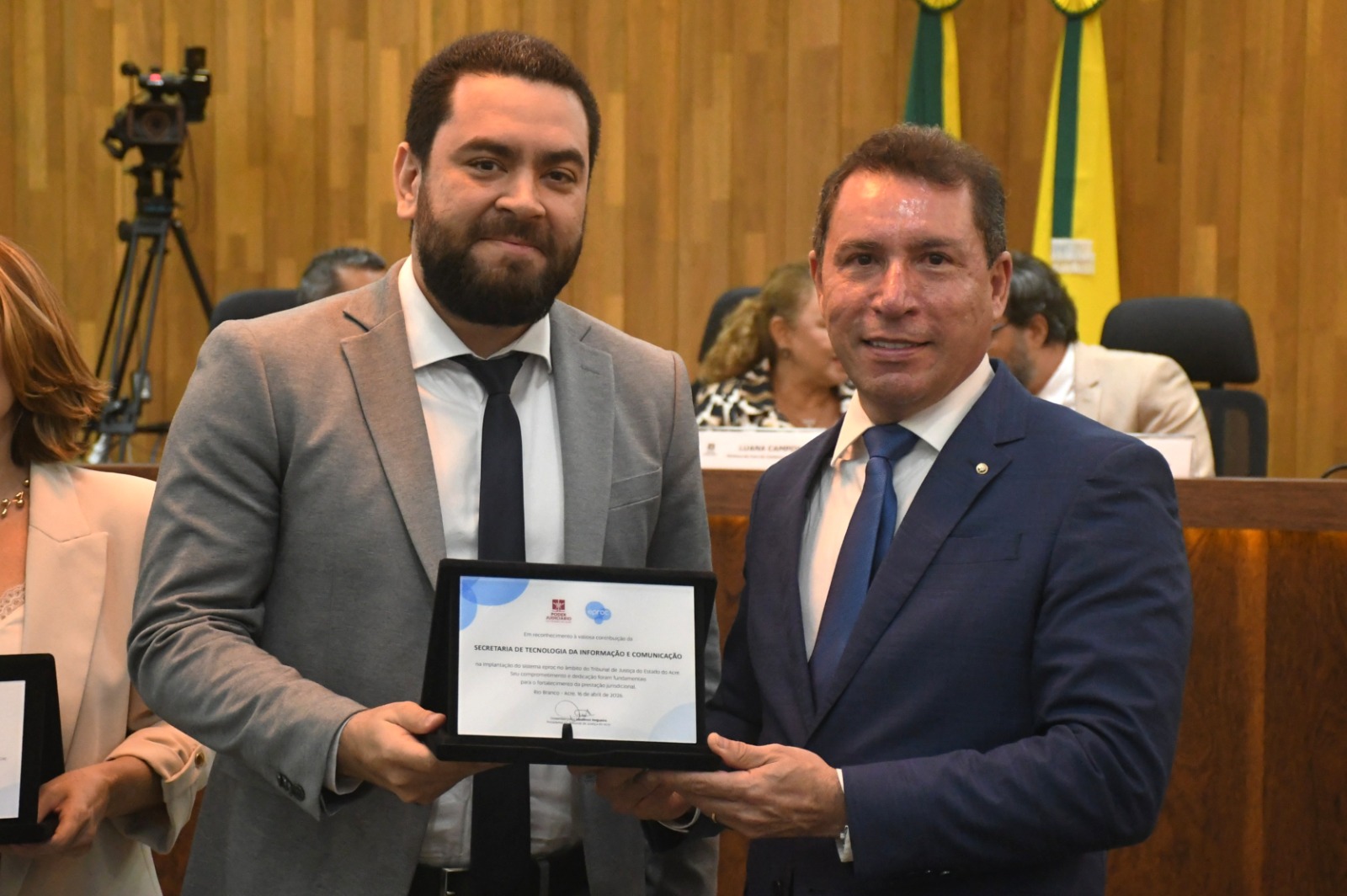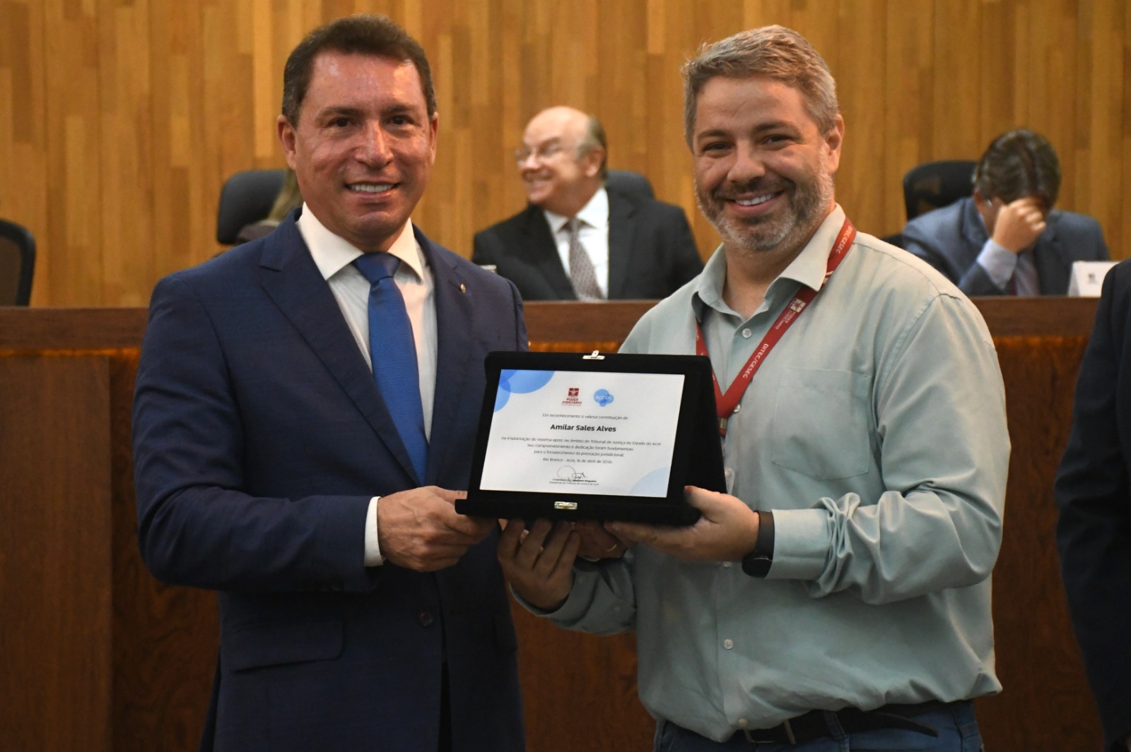 A solenidade se encerrou com a entrega de placas de homenagem às servidoras, servidores, secretárias, secretários e membros da Administração, como um símbolo de valorização ao esforço e comprometimento com a modernização do TJAC.