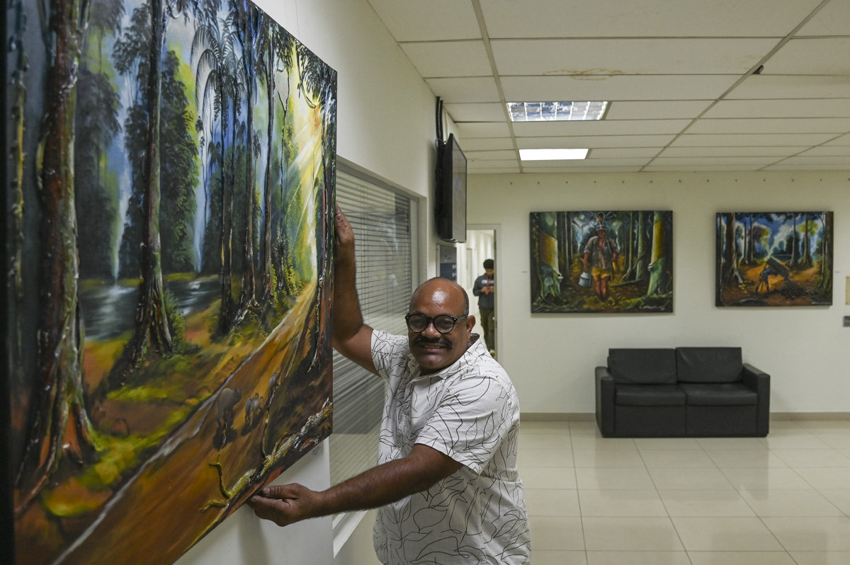 Obras sobre o cotidiano da vida na floresta amazônica são expostas no prédio do TJAC